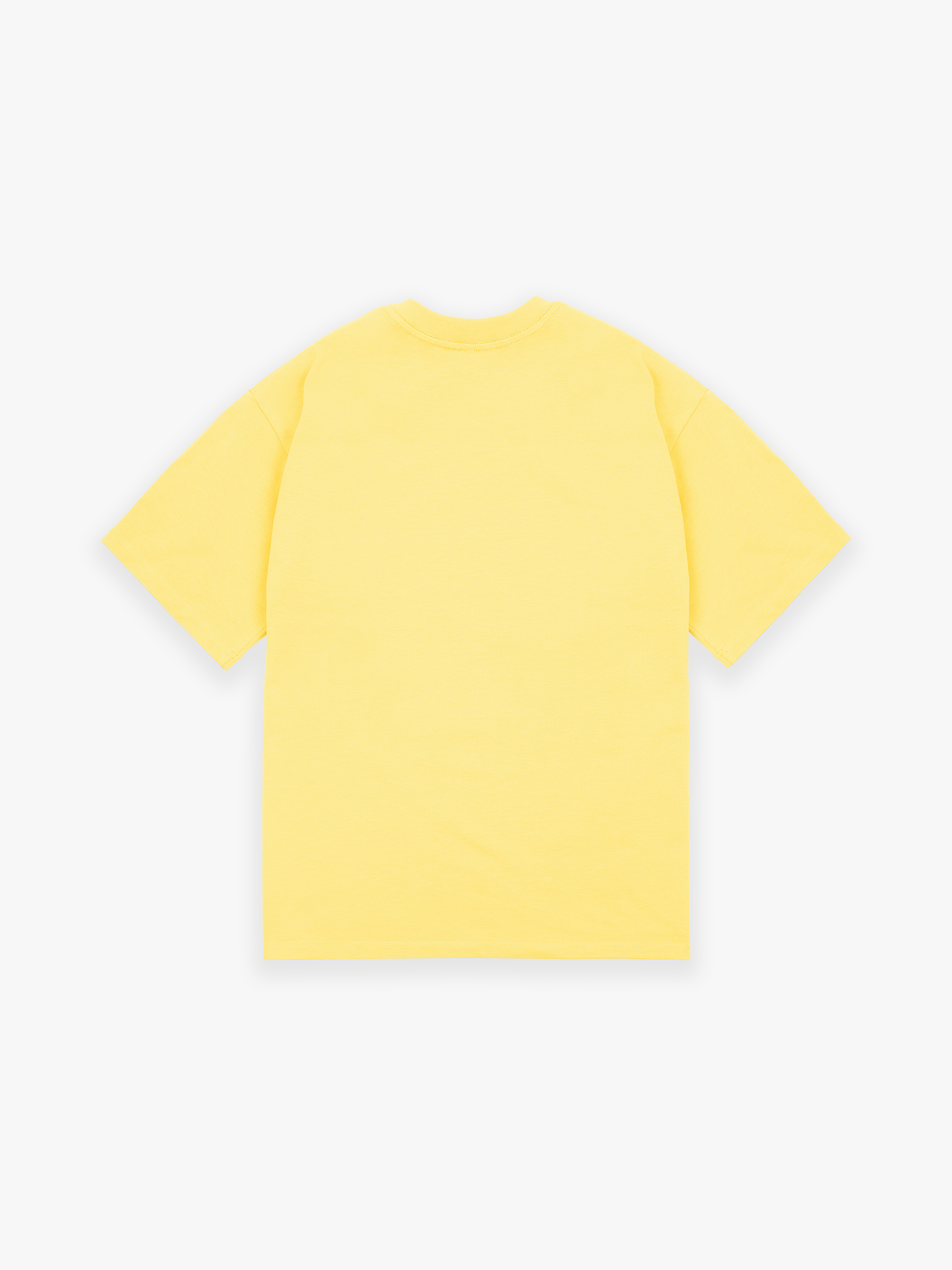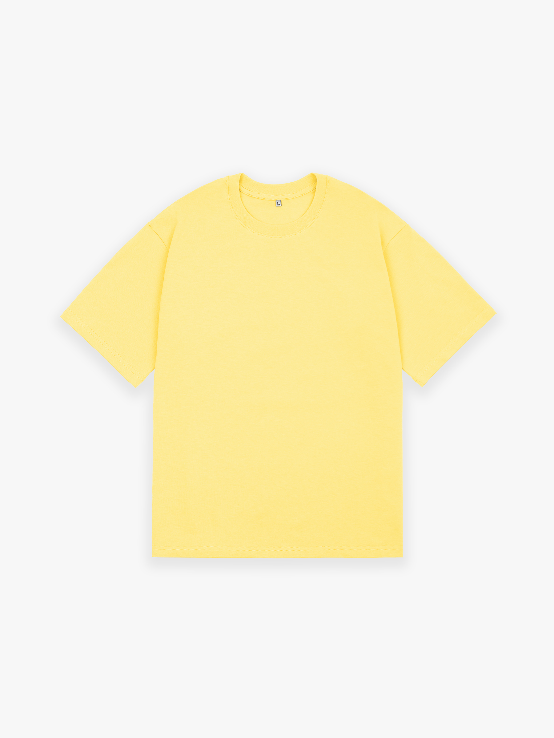 Базовая оверсайз футболка желтого цвета. Свободный силуэт, умеренный оверсайз и спущенная линия плеча.