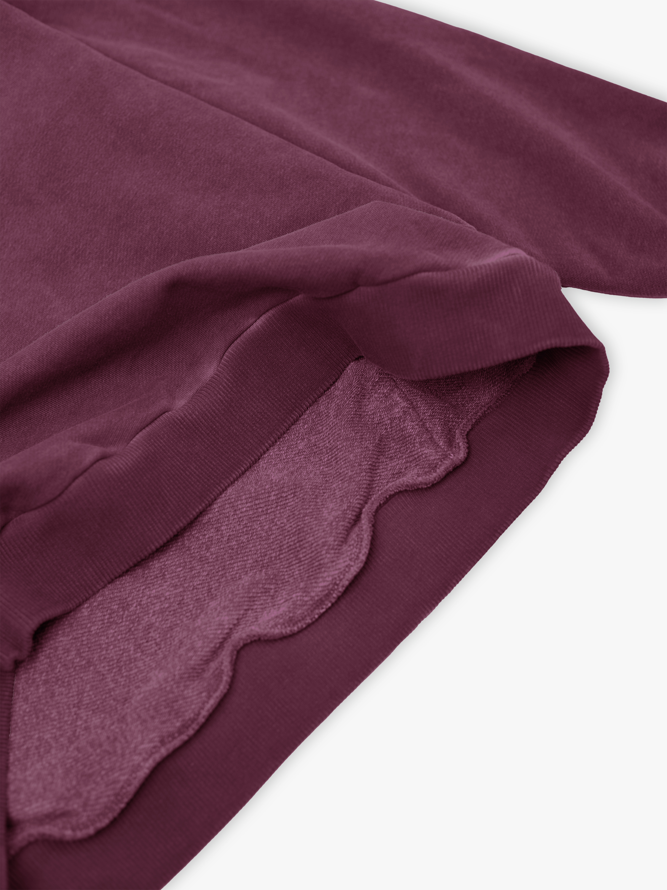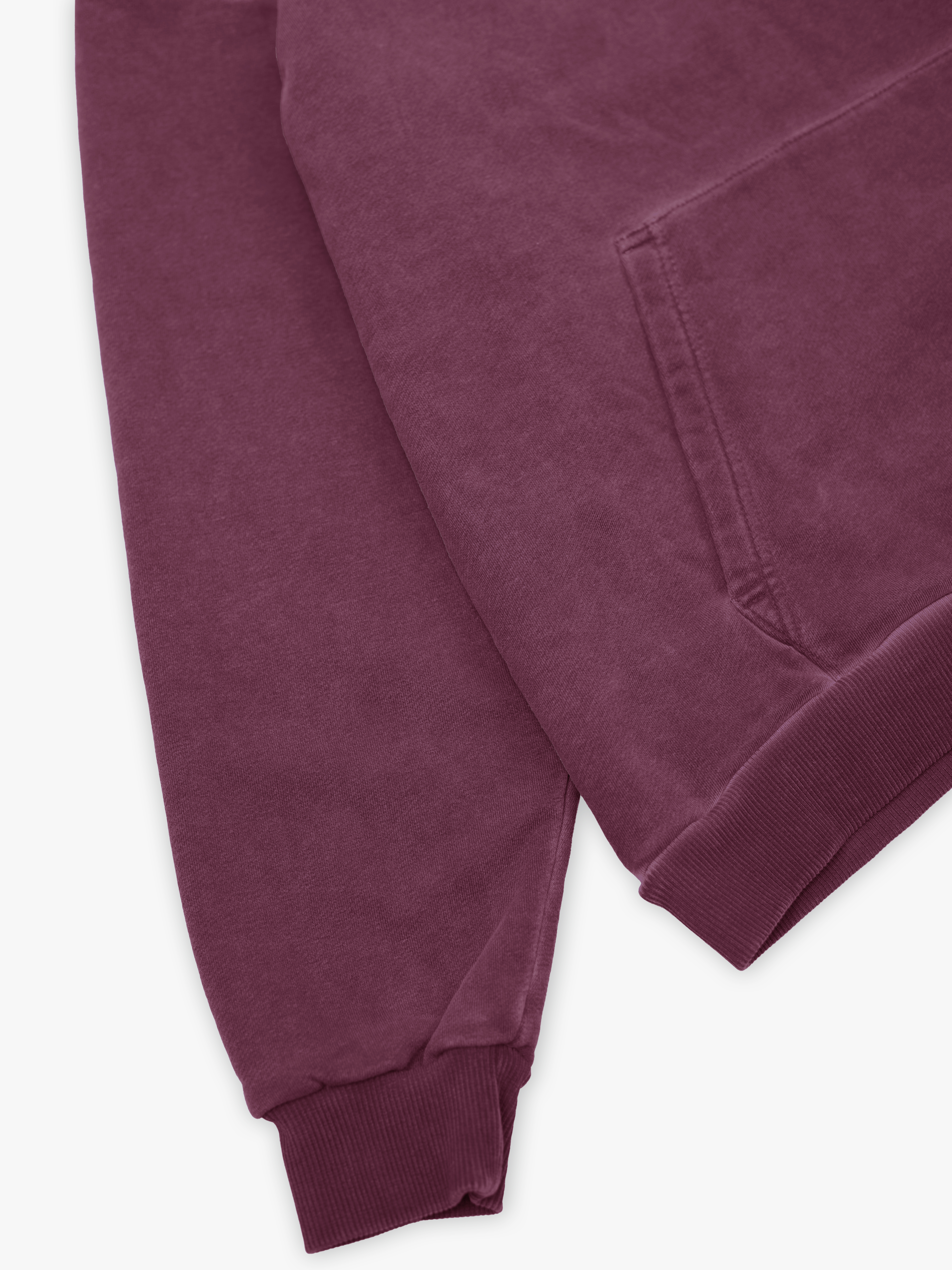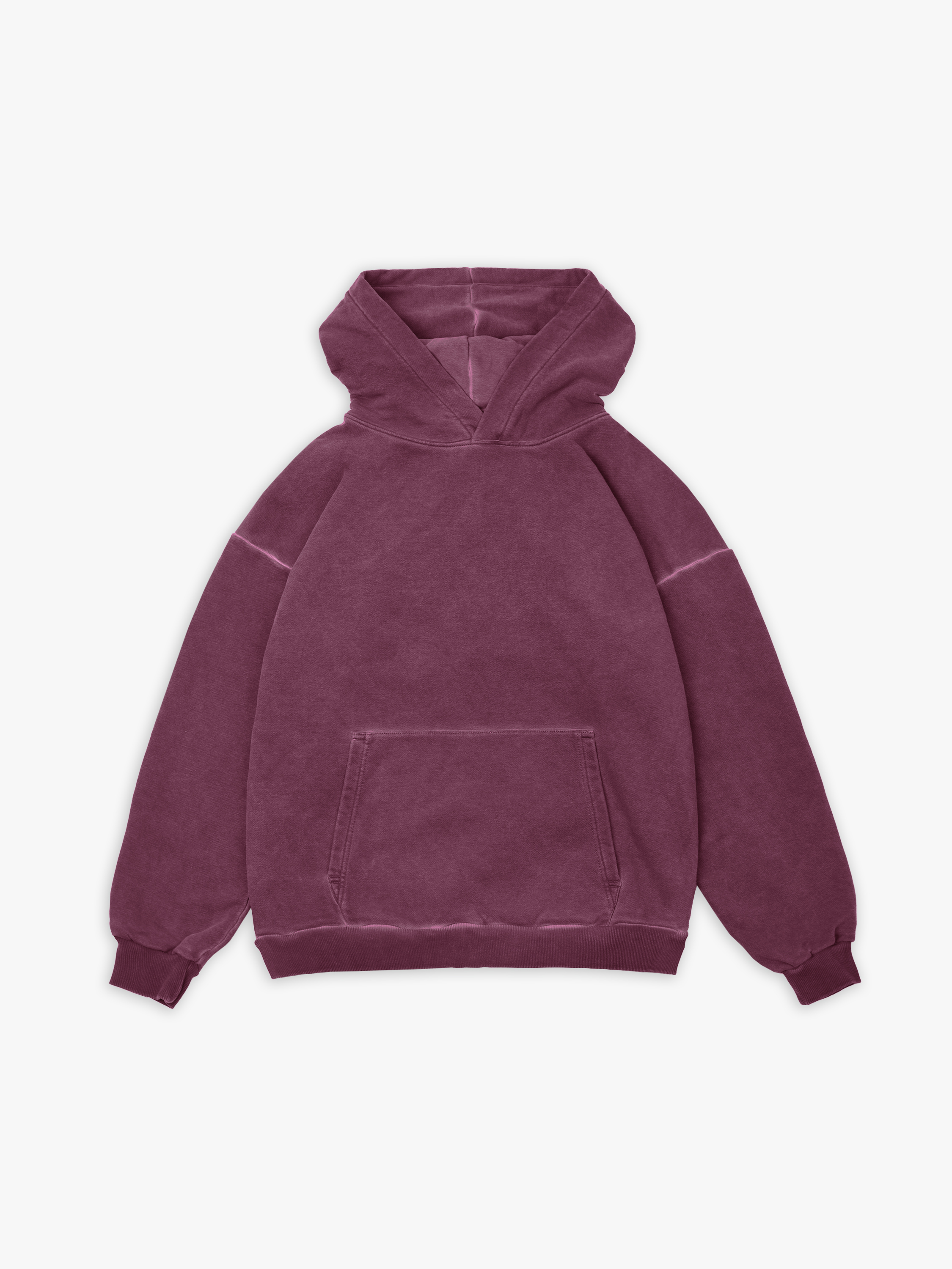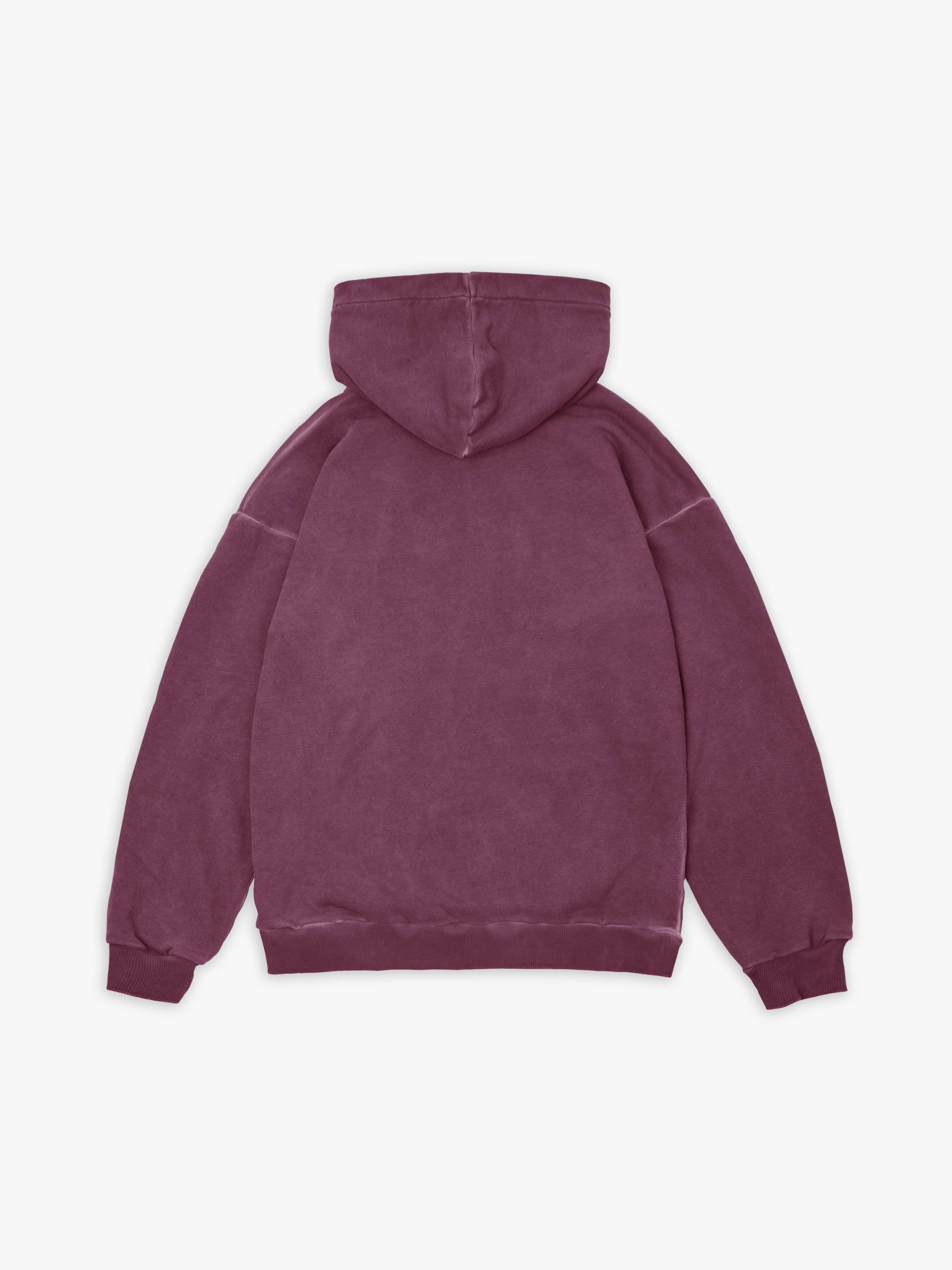 Худи полимерного крашения. Бордовый оттенок получился путем крашения готового изделия белого цвета, под высокой температурой. Текстура худи неравномерная, с естественным локальным эффектом непрокрашенности.