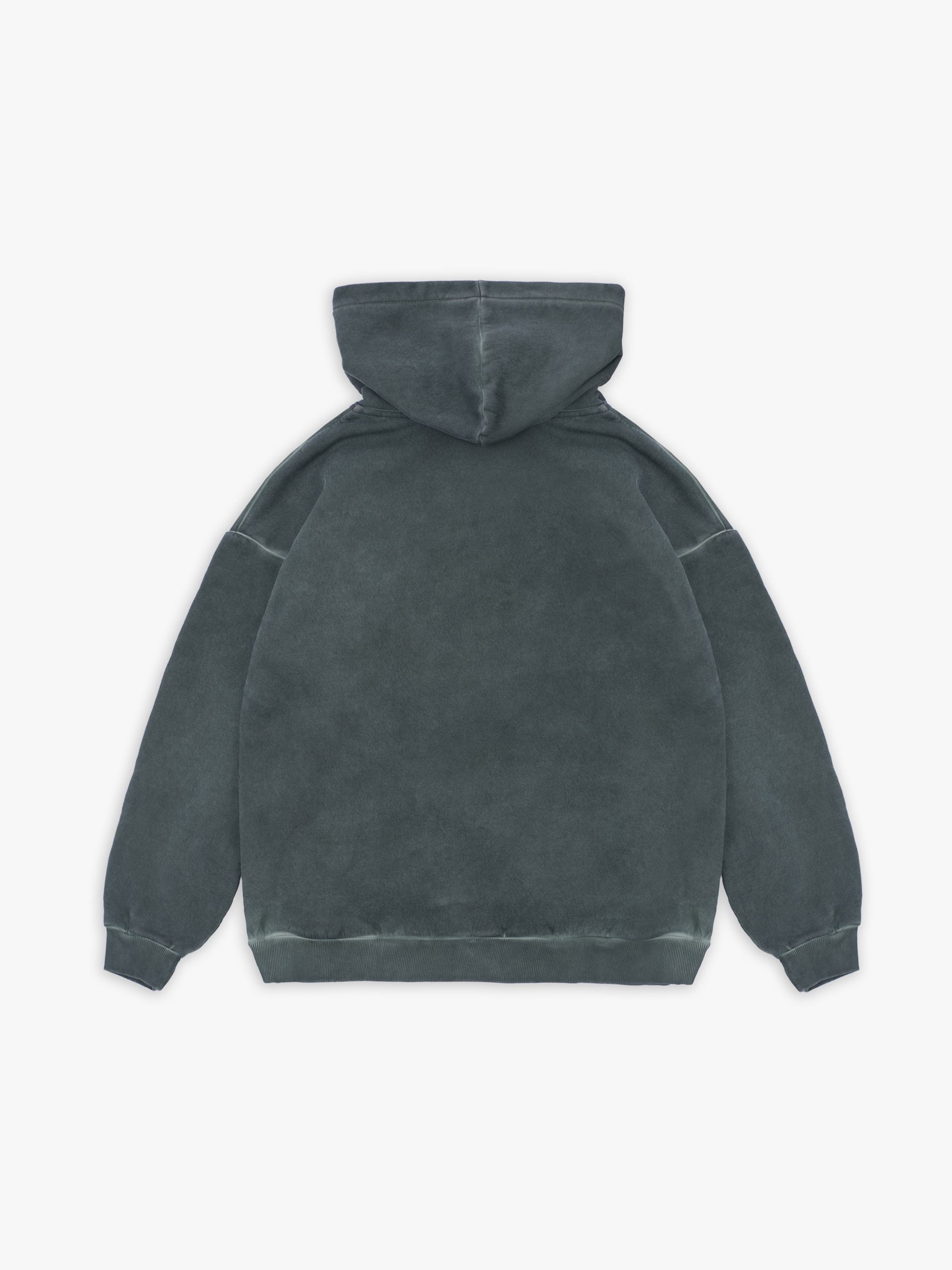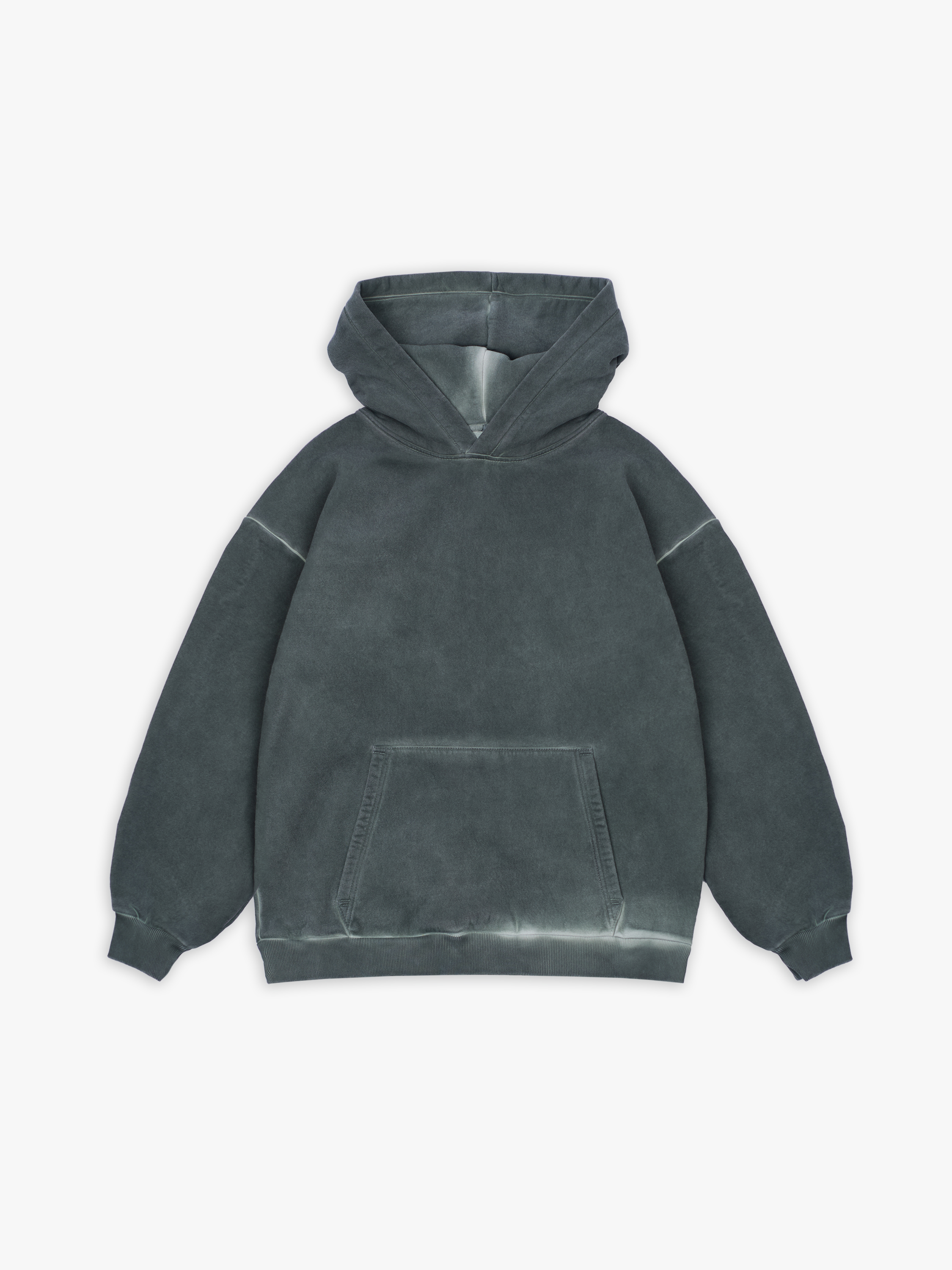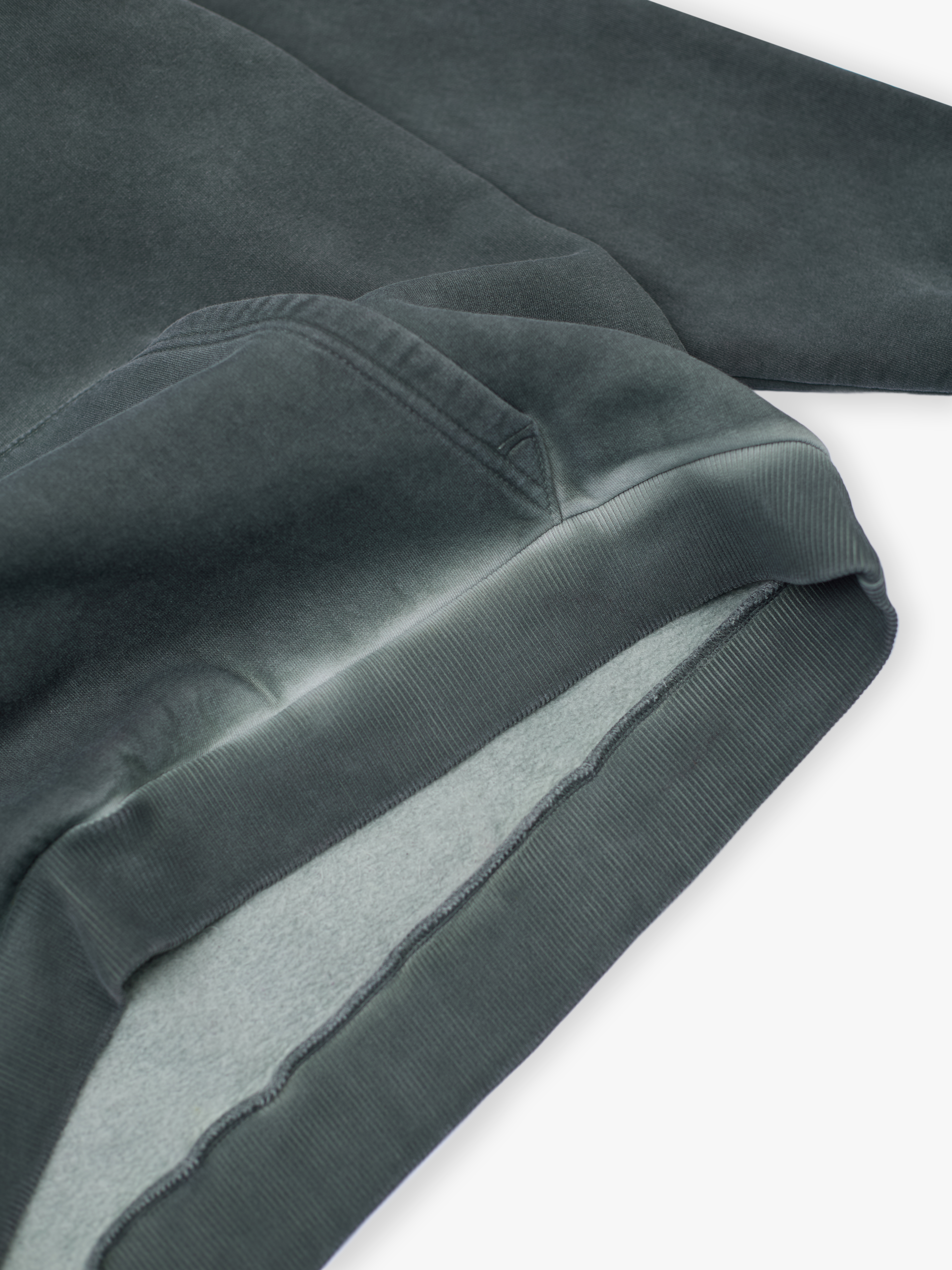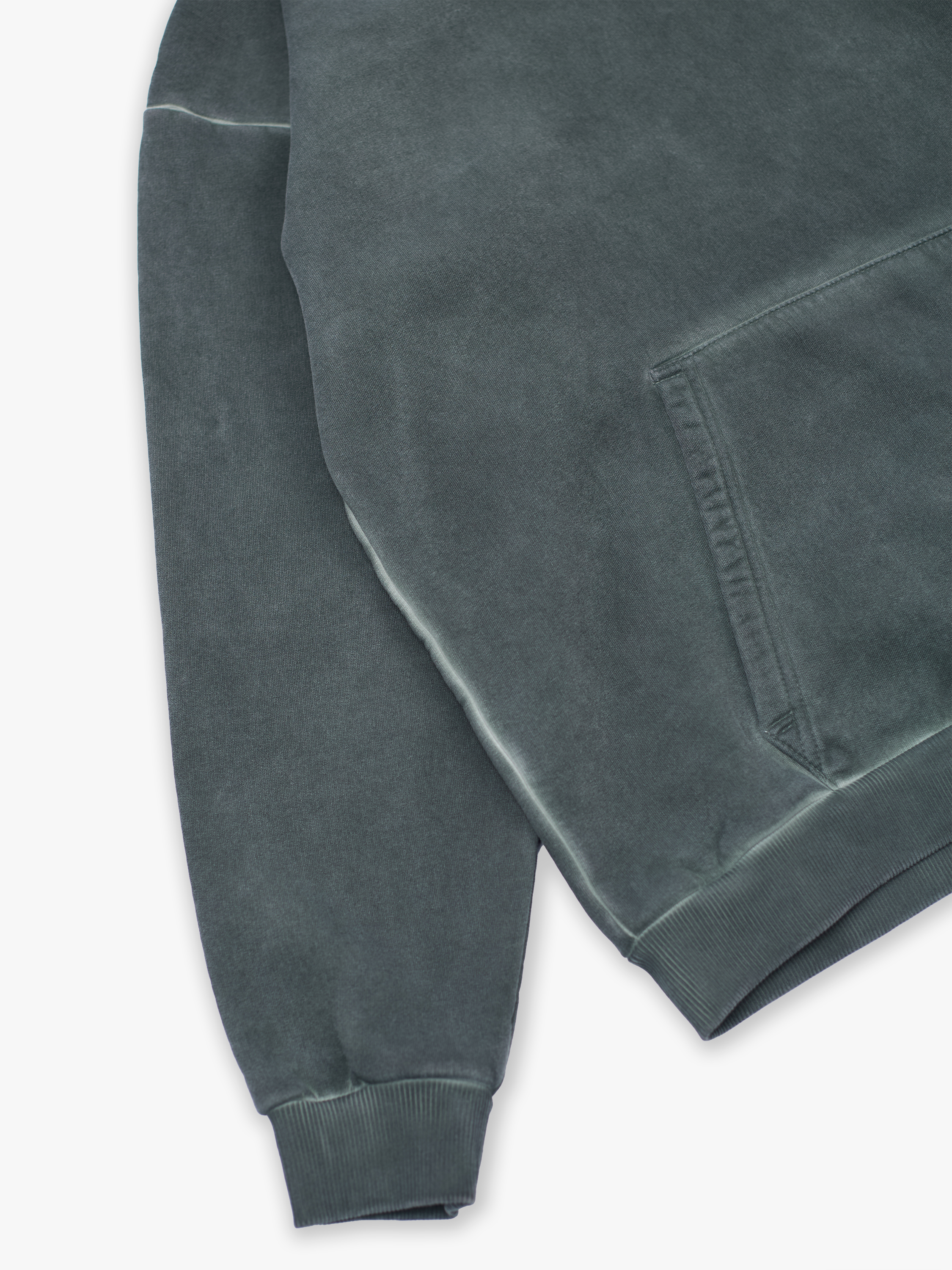 Худи полимерного крашения. Темно-зеленый оттенок получился путем крашения готового изделия белого цвета, под высокой температурой. Текстура худи неравномерная, с естественным локальным эффектом непрокрашенности.