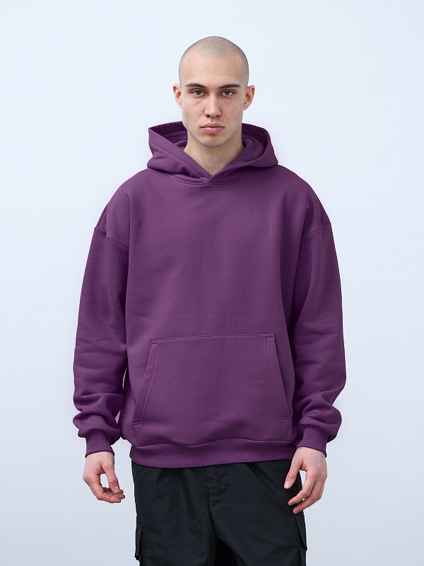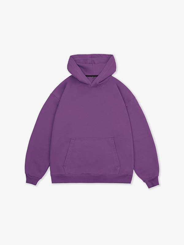 Худи оверсайз свободного кроя, средней длины и спущенной линией плеча. Манжеты и пояс выполнены из эластичного полотна "кашкорсе". Горловина по спинке усилена киперной лентой, по центру вшит тканевый жаккардовый размерник черного цвета. Без шнурков в капюшоне.