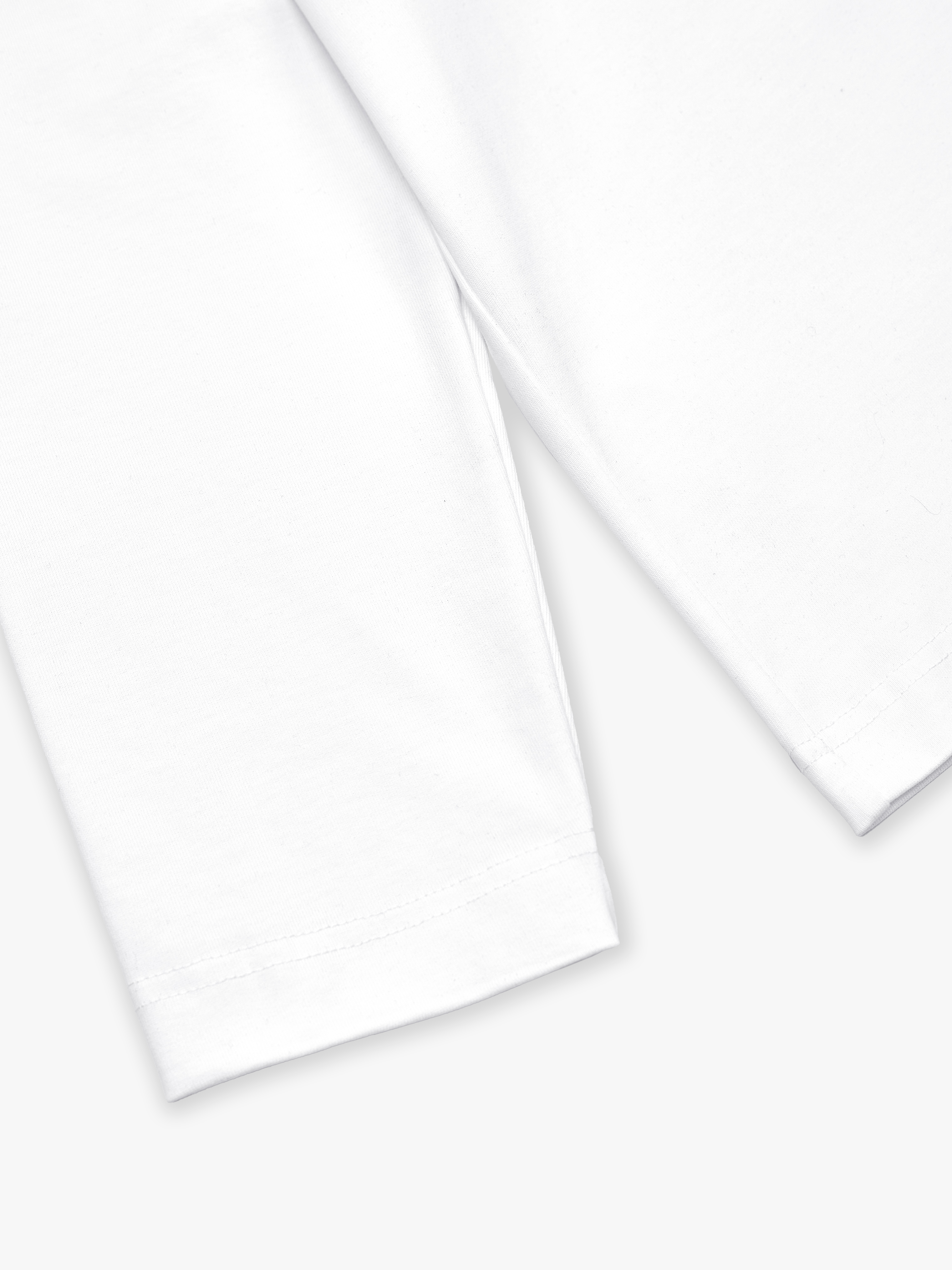Белый лонгслив стандартного классического кроя. Манжеты и низ обработаны подгибом в 3 см. Выполнен из трикотажного полотна "кулирная гладь", премиального качества "пенье компакт", созданного по уникальной технологии специально для компании Моспошив.