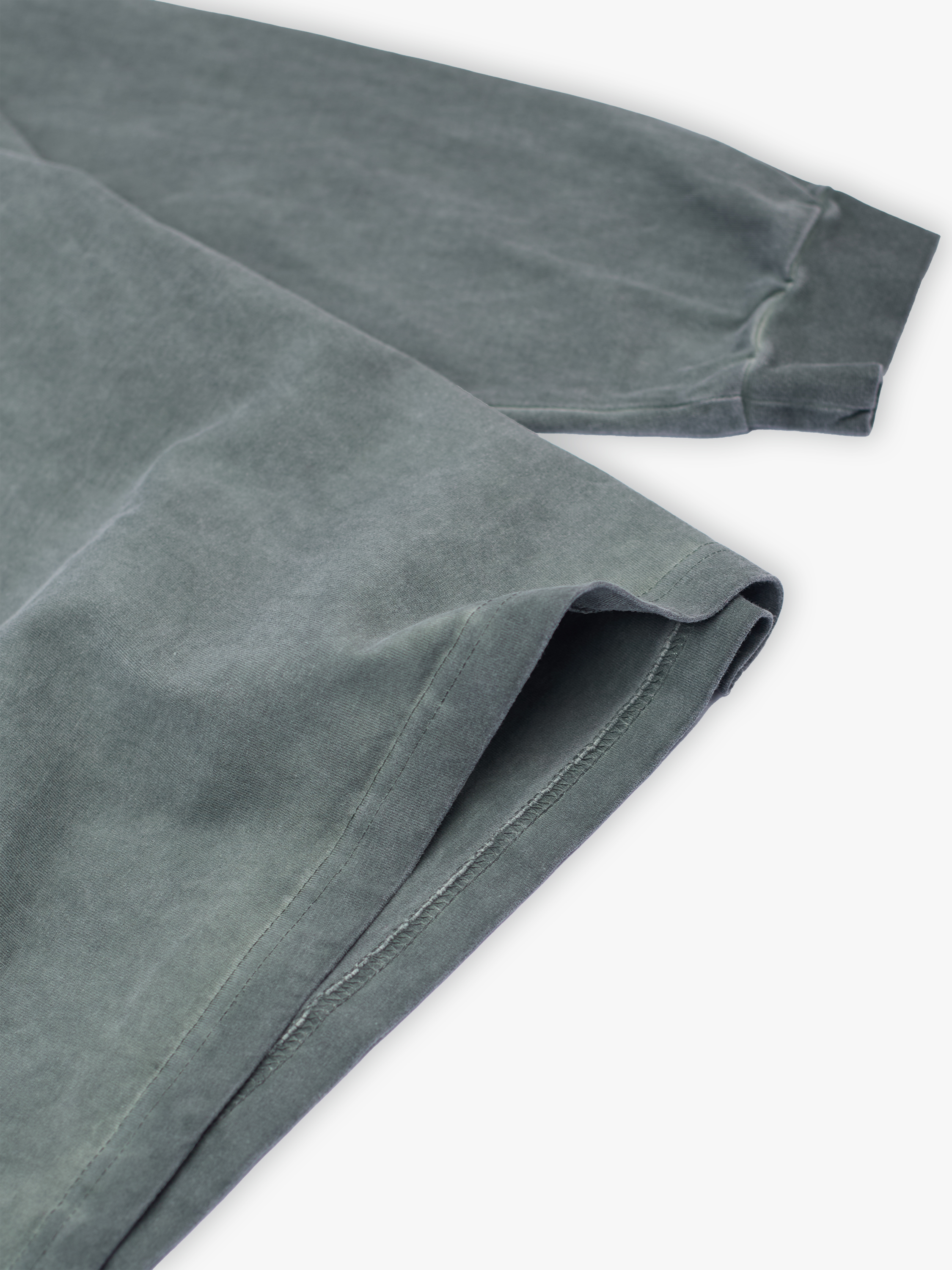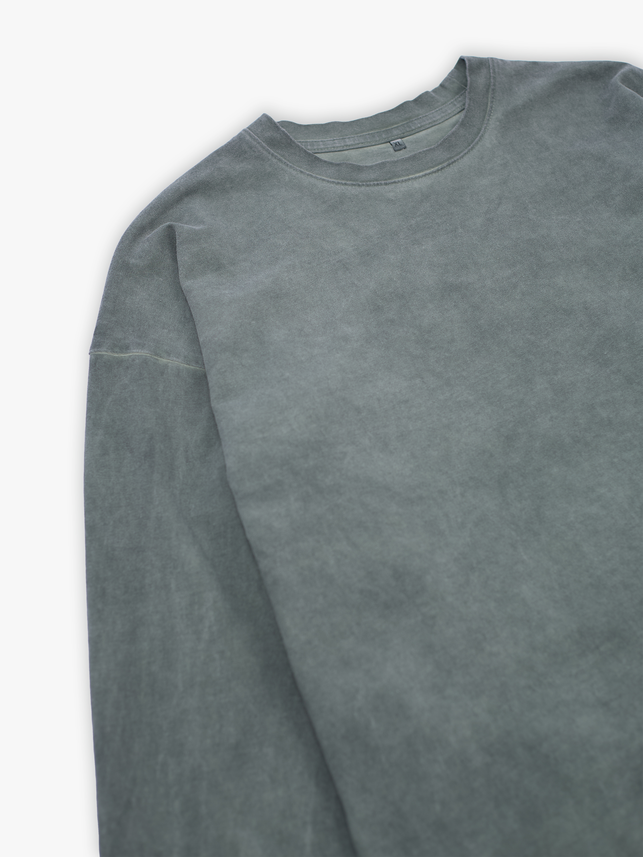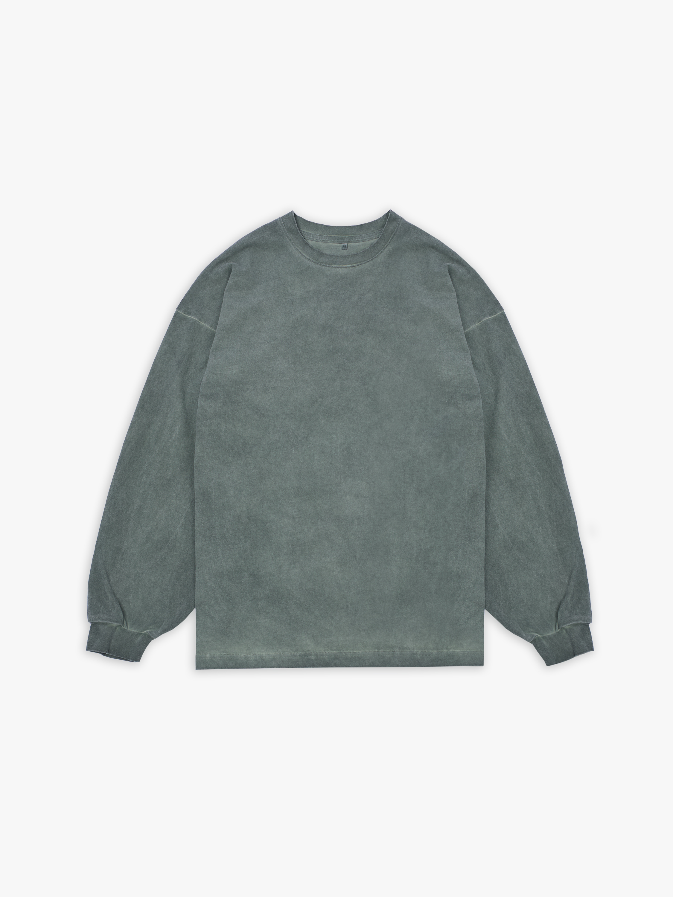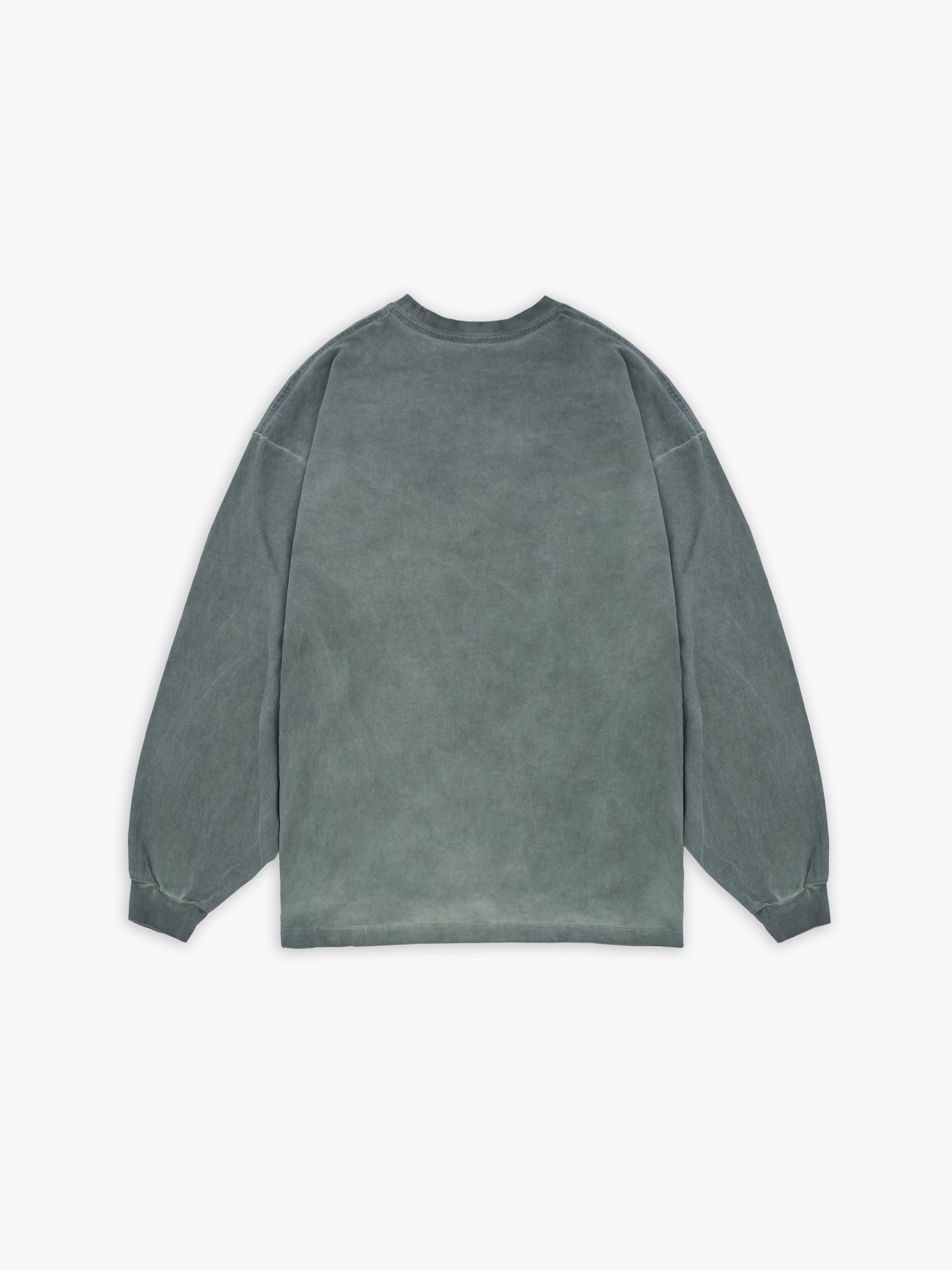 Лонгслив полимерного крашения. Темно-зеленый оттенок получился путем крашения готового изделия белого цвета, под высокой температурой. Текстура лонгслива неравномерная, с естественным локальным эффектом непрокрашенности.