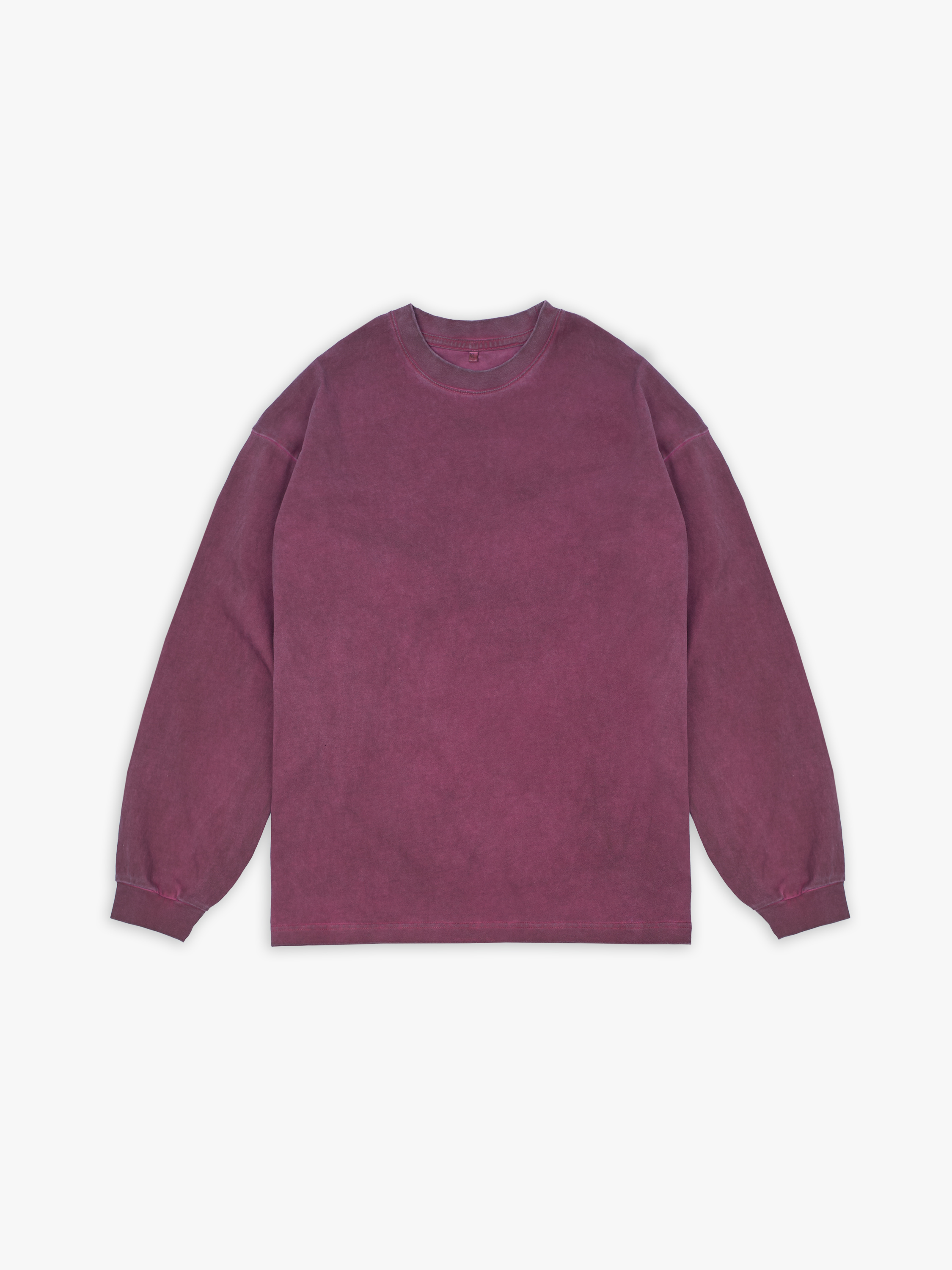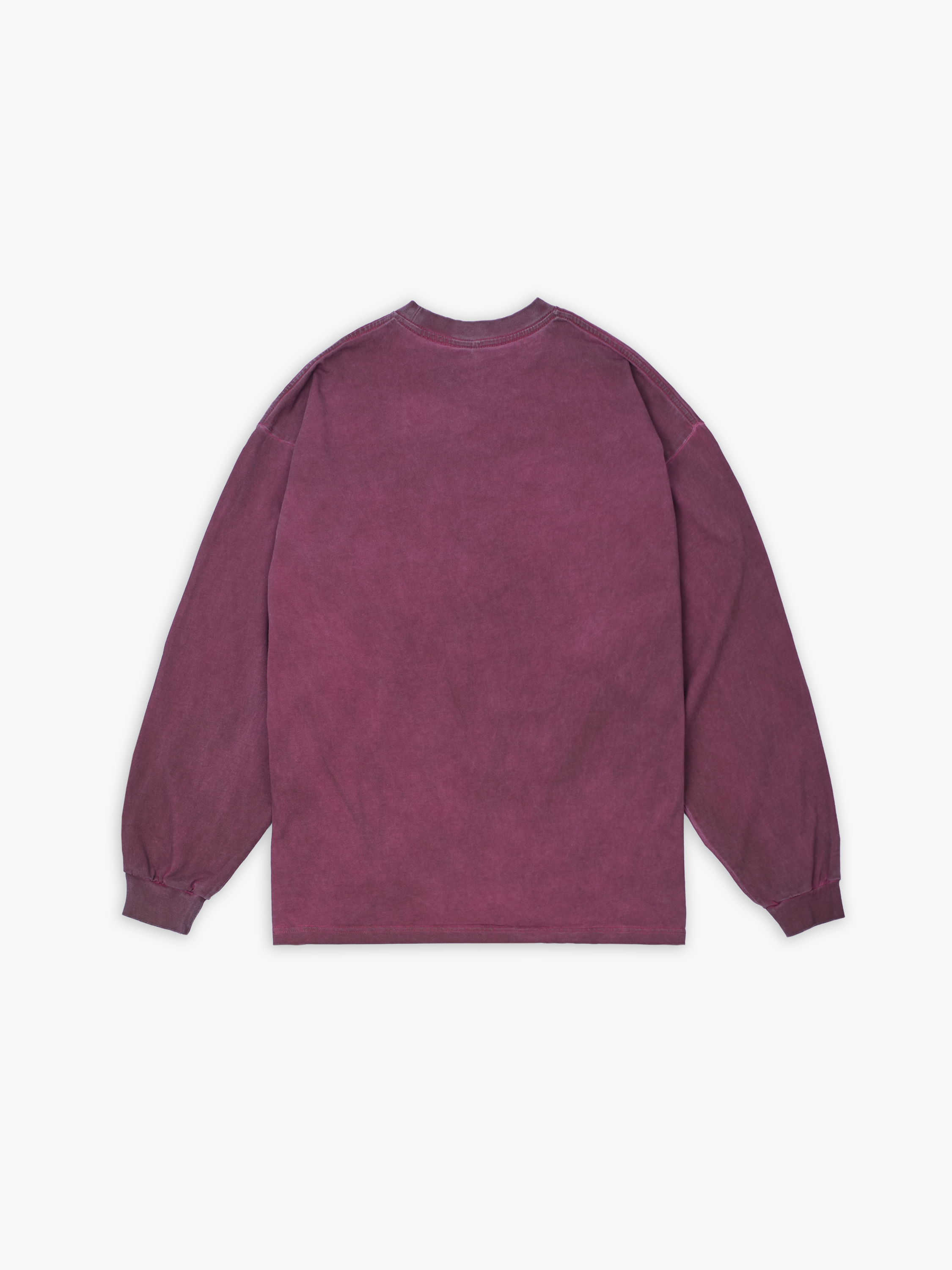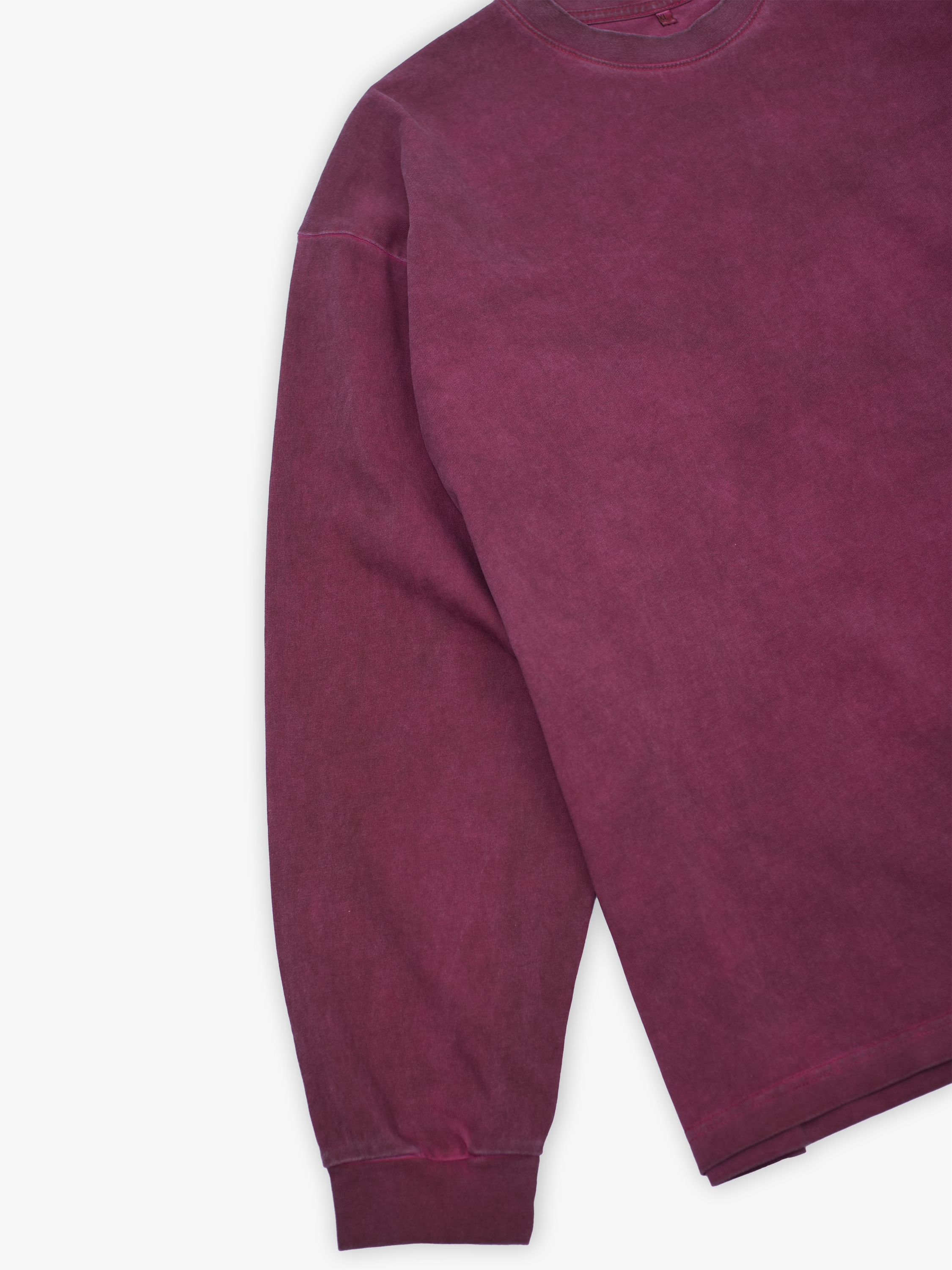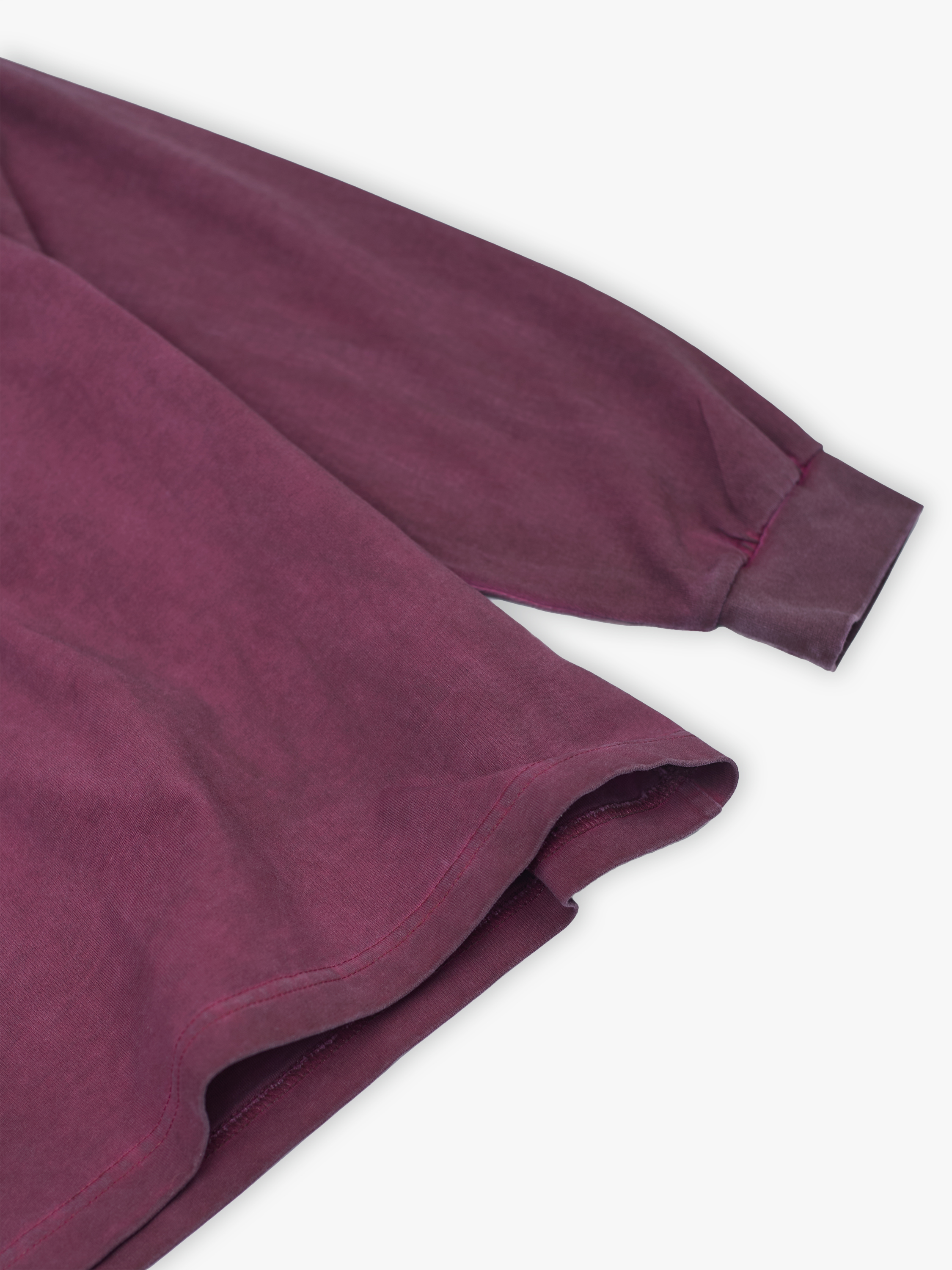 Лонгслив полимерного крашения. Бордовый оттенок получился путем крашения готового изделия белого цвета, под высокой температурой. Текстура лонгслива неравномерная, с естественным локальным эффектом непрокрашенности.
