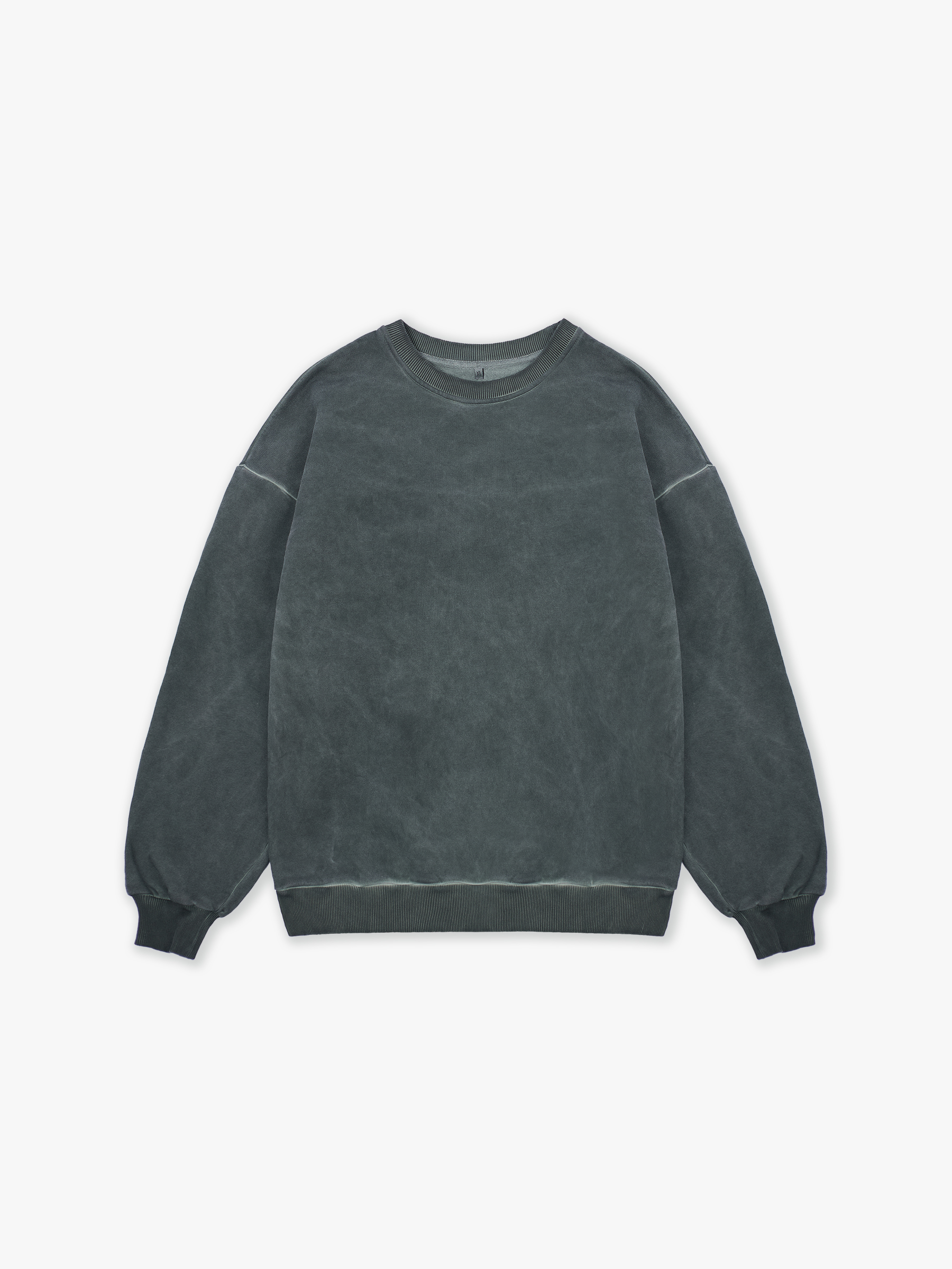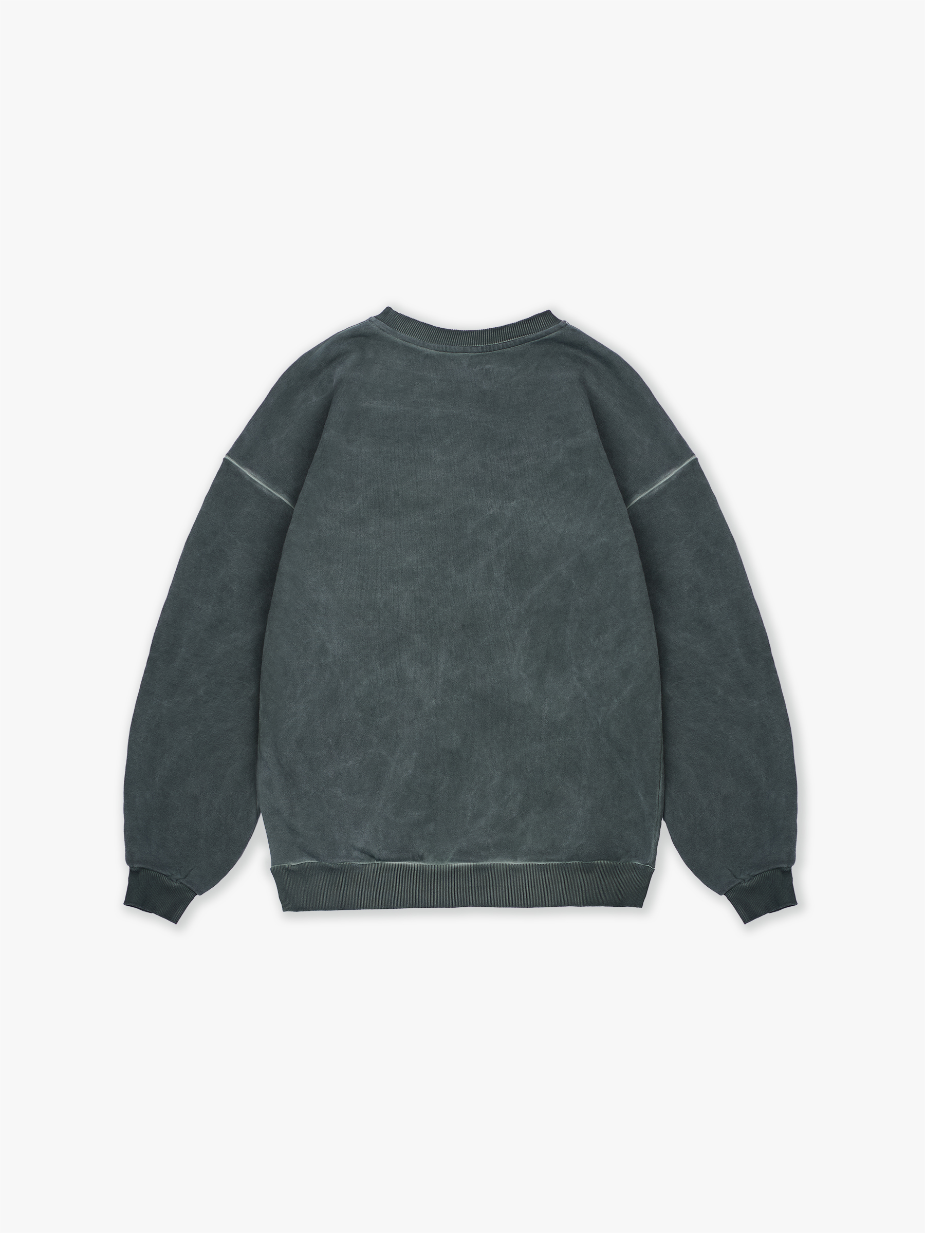 Свитшот полимерного крашения. Темно-зеленый оттенок получился путем крашения готового изделия белого цвета, под высокой температурой. Текстура свитшота неравномерная, с естественным локальным эффектом непрокрашенности.